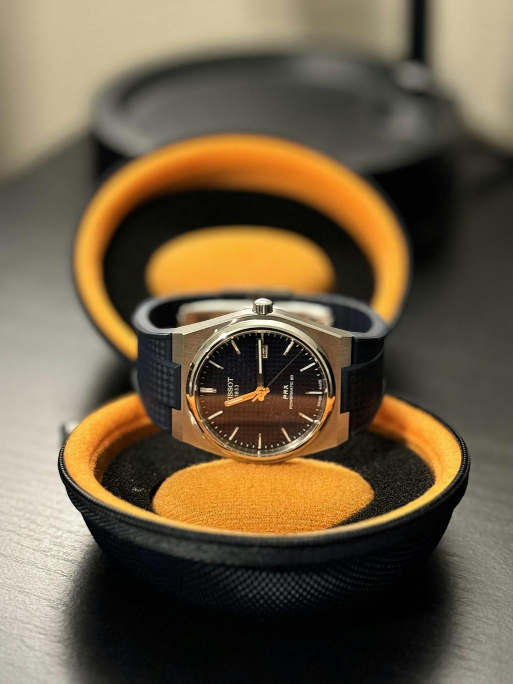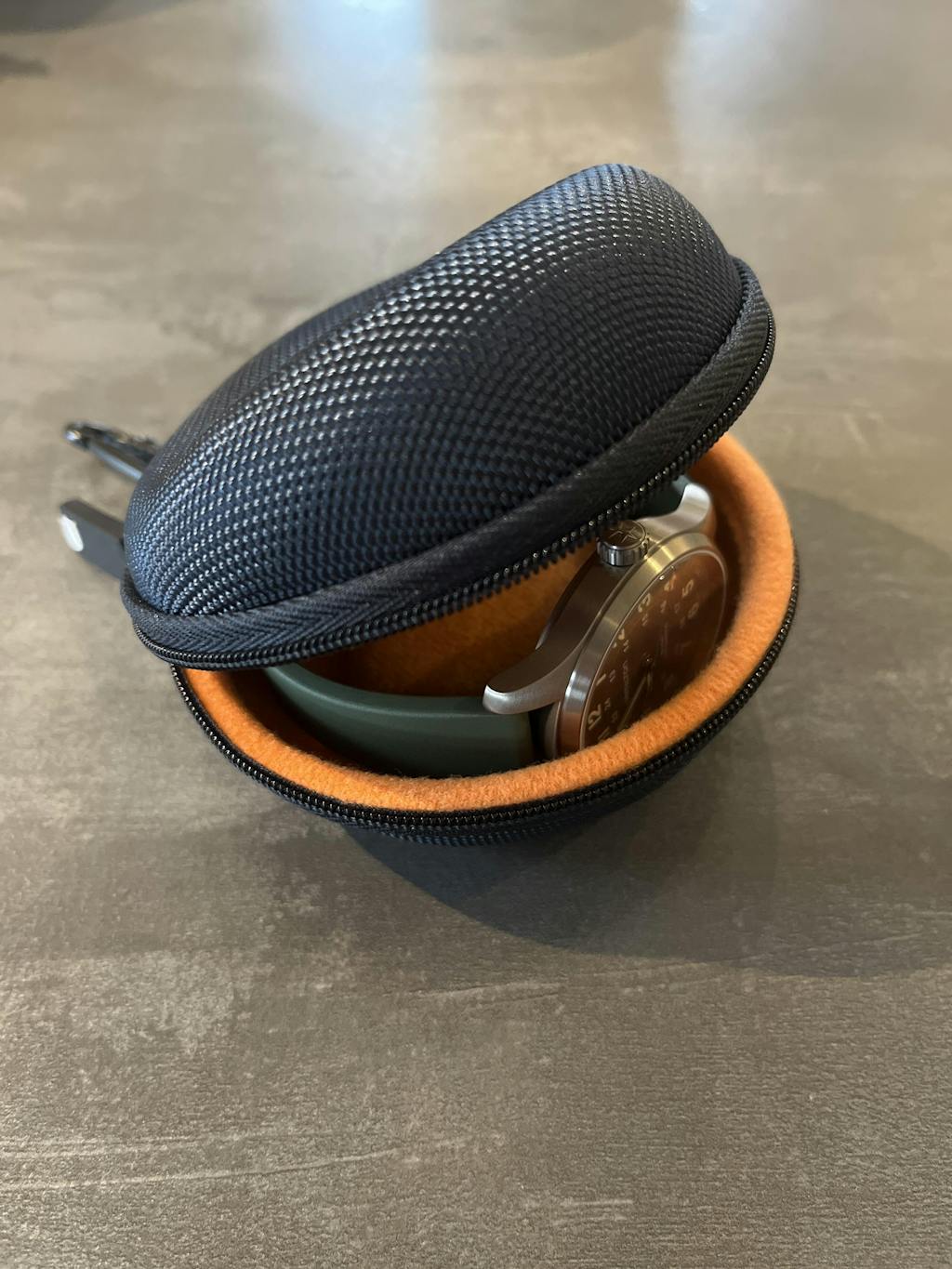 The Bagel is a hard shell case shaped like a bagel (or a donut, whichever you fancy) that holds a single watch. Whether your watch is fitted on a bracelet, leather strap, CTS rubber strap, or NATO, the Bagel works perfectly because of the indented middle that keeps the watch head away from any other metal parts (like a metal bracelet, or a buckle / clasp).