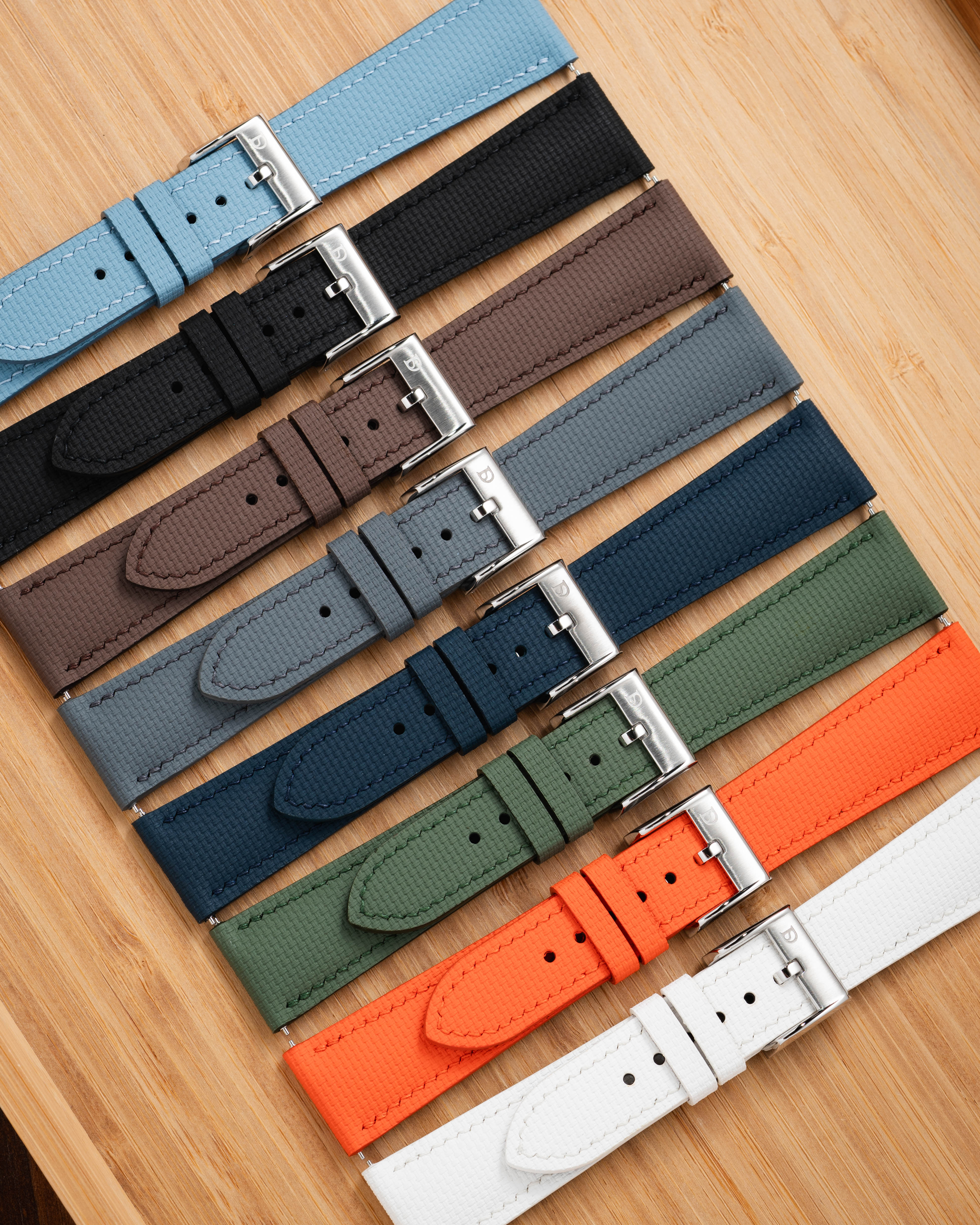 Introducing our innovative take on the Sailcloth strap—crafted from FKM rubber molded with a Sailcloth pattern. We’ve seamlessly blended the classic, rugged aesthetic of Sailcloth with the modern advantages of FKM rubber. The result is a strap that offers the iconic look of Sailcloth while providing enhanced durability and comfort.