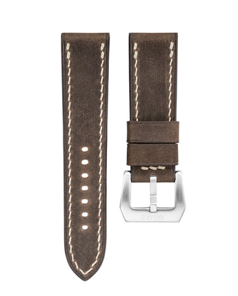 Crazy Horse leather is what you get when you mix Nubuck and Pueblo into one leather. You get the velvety, soft texture of Nubuck, with the varied look, smooth surface and great patina potential of Pueblo. Crazy Horse leather will accumulate scratches with daily use, with variations in the colour tones as you put the strap through its paces. This is what makes this leather so attractive - these marks will only improve the vintage look of the strap, allowing the beauty of the leather to be the real attraction.