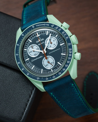 We've developed a total of 11 designs, curated to compliment each of the first 11 MoonSwatches, allowing the pairing to be seamless. These straps use the same leather and style from straps you love from Delugs, but with characteristics of two-tone accents in the stitching, edge paint and keepers.
