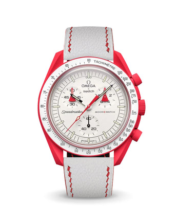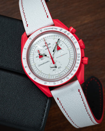 We've developed a total of 11 designs, curated to compliment each of the first 11 MoonSwatches, allowing the pairing to be seamless. These straps use the same leather and style from straps you love from Delugs, but with characteristics of two-tone accents in the stitching, edge paint and keepers.