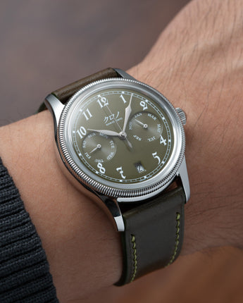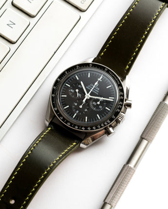 The strap looks even better in person. I think the green/brown hue will go great with any vintage or vintage-themed watch. The stitching looks rather loud in the pictures but is a bit more subdued in natural light.