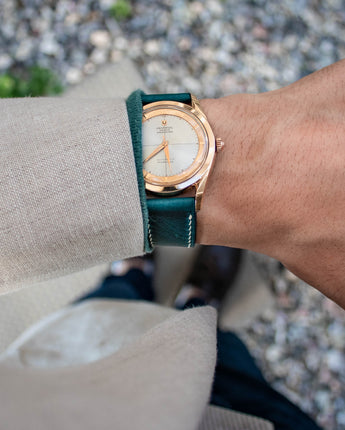 Excerpt from Strap Guide by Daniel: "Despite the name, this strap has a lot of green in it! The full stitching makes it a perfect companion to dress up with, but the unique color helps to bring out the casual vibes quite a bit as well. The green hues pairs well with a green shirt, and the blue hues pair well with the jeans. In a way, the strap mirrors the versatility of the Polerouter. It can be as dressy or as casual as you want it to be, whichever way you decide to go."
