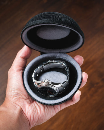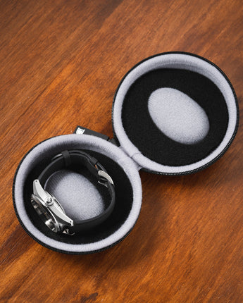 The Bagel is a hard shell case shaped like a bagel (or a donut, whichever you fancy) that holds a single watch. Whether your watch is fitted on a bracelet, leather strap, CTS rubber strap, or NATO, the Bagel works perfectly because of the indented middle that keeps the watch head away from any other metal parts (like a metal bracelet, or a buckle / clasp).
