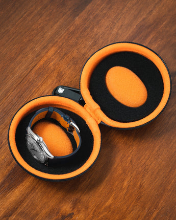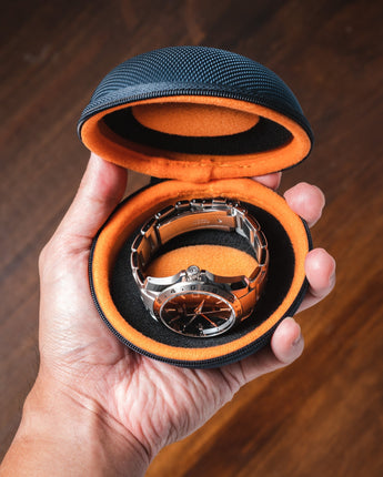 The Bagel is a hard shell case shaped like a bagel (or a donut, whichever you fancy) that holds a single watch. Whether your watch is fitted on a bracelet, leather strap, CTS rubber strap, or NATO, the Bagel works perfectly because of the indented middle that keeps the watch head away from any other metal parts (like a metal bracelet, or a buckle / clasp).
