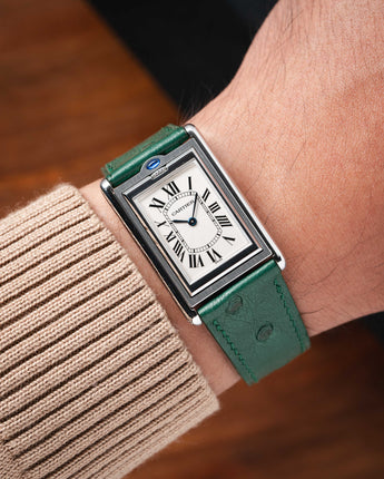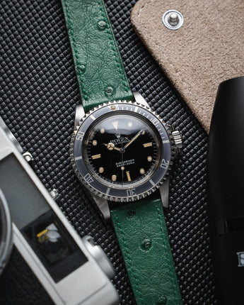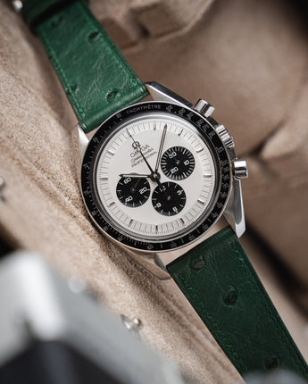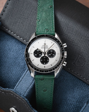 Supple and full of character, Ostrich Body leather is instantly recognisable by its naturally dotted texture. Its soft, pliable feel makes it especially comfortable on the wrist. If you're looking for an exotic leather with a distinct character from Alligator, this makes an excellent choice.