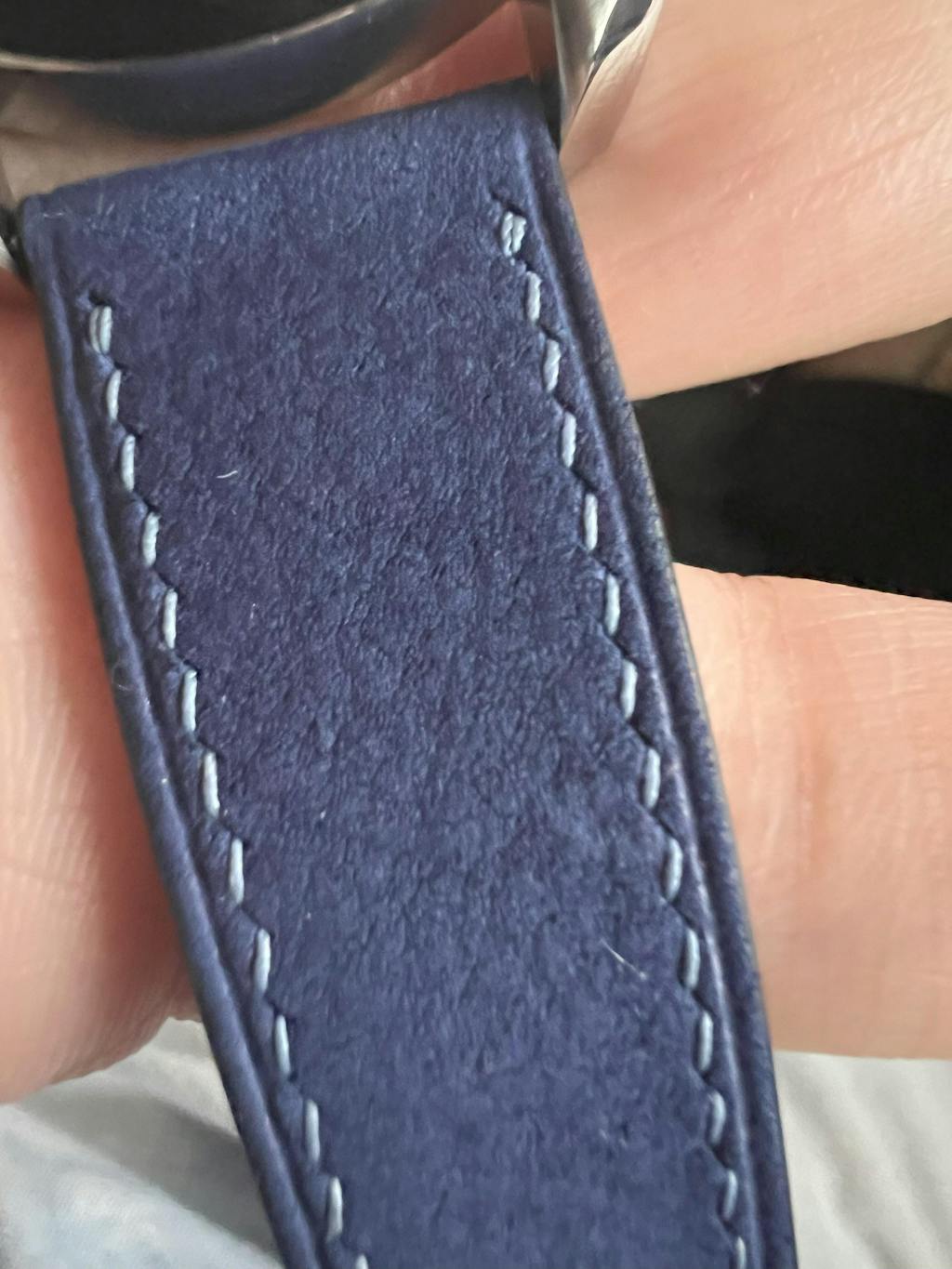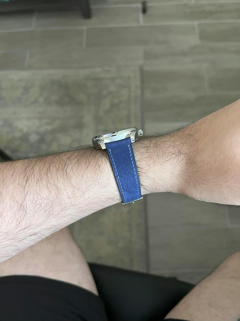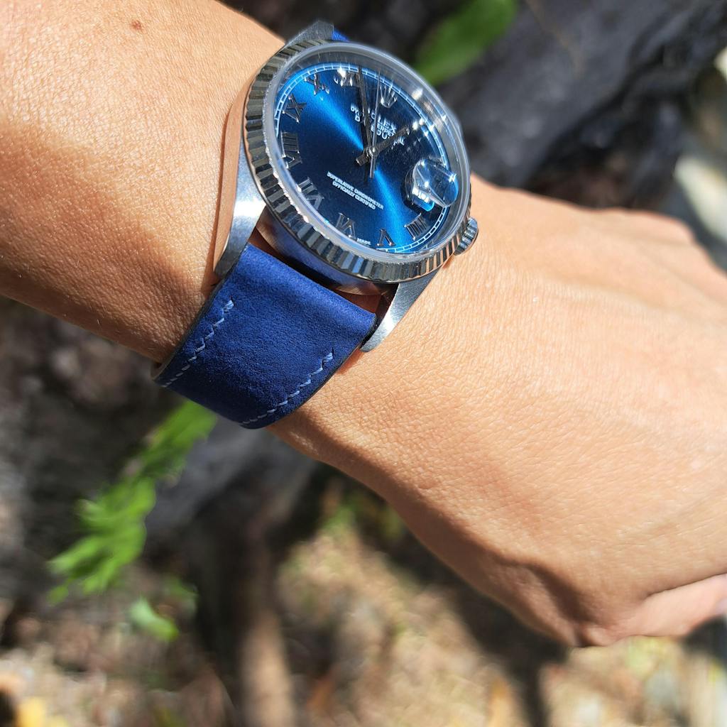 Nubuck has a soft touch with a short and even nap. It is supple and flexible from the start, but yet has just the right amount of structure. This strap is great if you are looking for something that's casual enough for all your daily activities, soft and comfortable to the touch, and an alternative to regular leather texture.