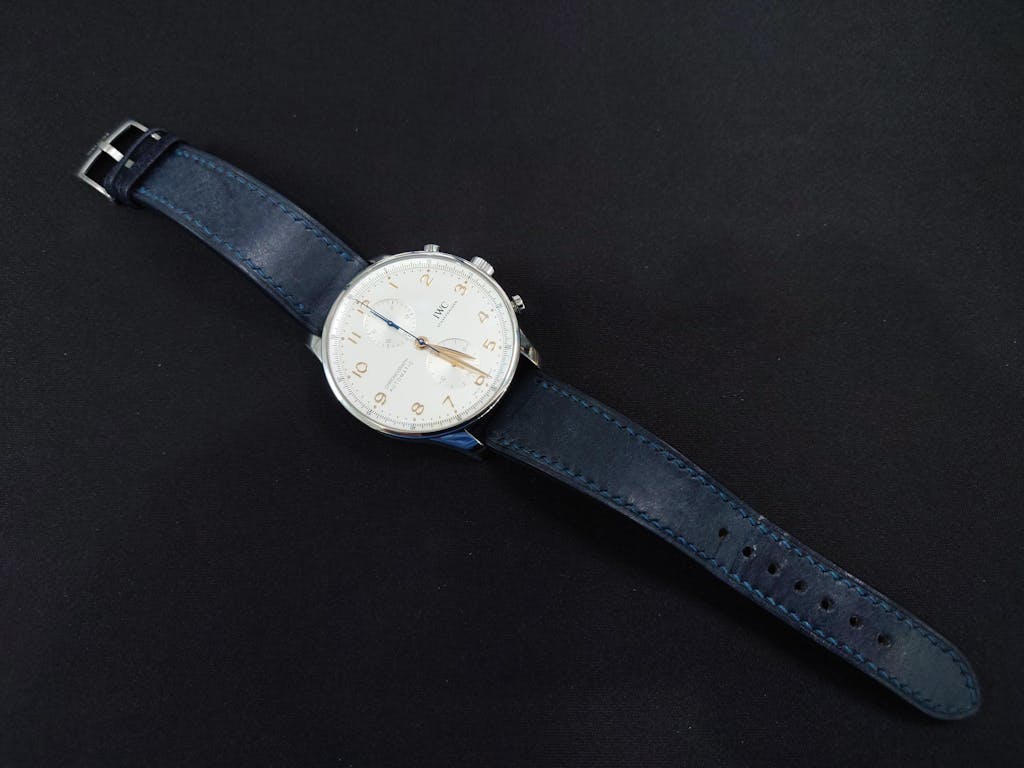 Excerpt from Strap Guide by Kelven: "The dark denim blue and the textural pattern of the leather on this strap makes it feel a little like an aged navy leather jacket or passport holder. It is also a very thin and very comfortable strap to wear that works really well with the rose gold, silver dial and blue hands. This combo could work with t-shirt and jeans but also do perfectly well in a business casual setting."