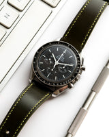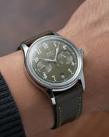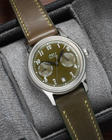 The strap looks even better in person. I think the green/brown hue will go great with any vintage or vintage-themed watch. The stitching looks rather loud in the pictures but is a bit more subdued in natural light.