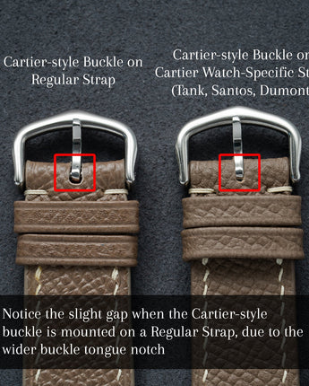 Cartier-style Buckles modelled after the OEM buckles from Cartier with its curvaceous shape and pointed tip. The buckle tongue width is 2.0mm and the strap holes are shaped round. We have the following specifications: