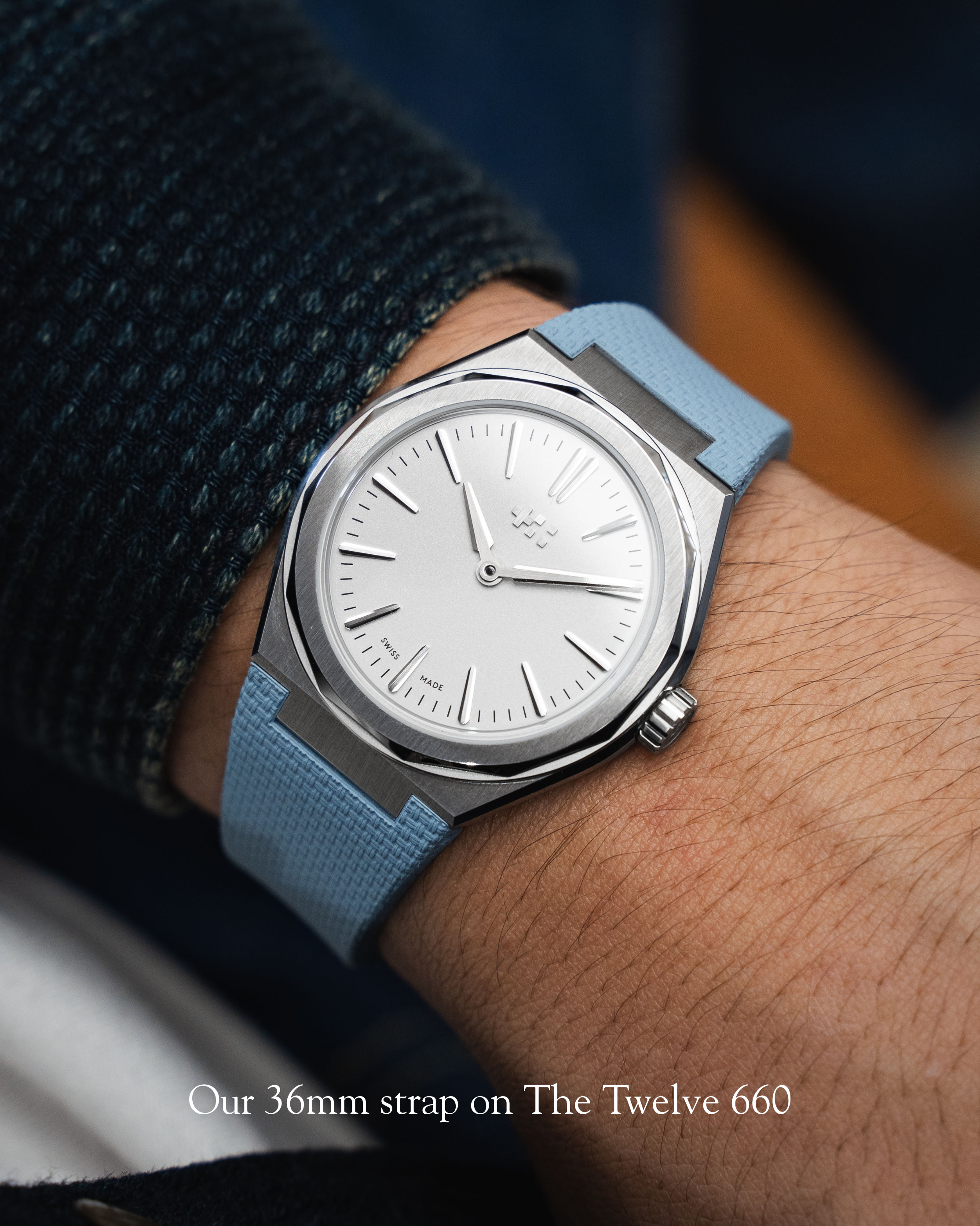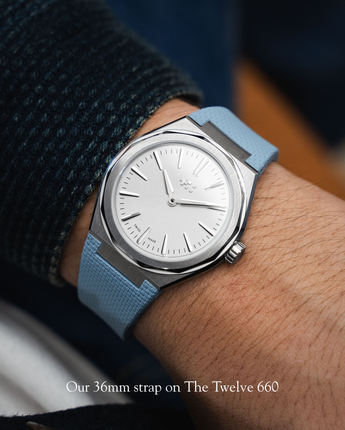 The sailcloth pattern complements The Twelve’s dial pattern perfectly, while the FKM rubber construction ensures durability, comfort, and resistance to dust, aging, and weather — staying fresh wear after wear.
