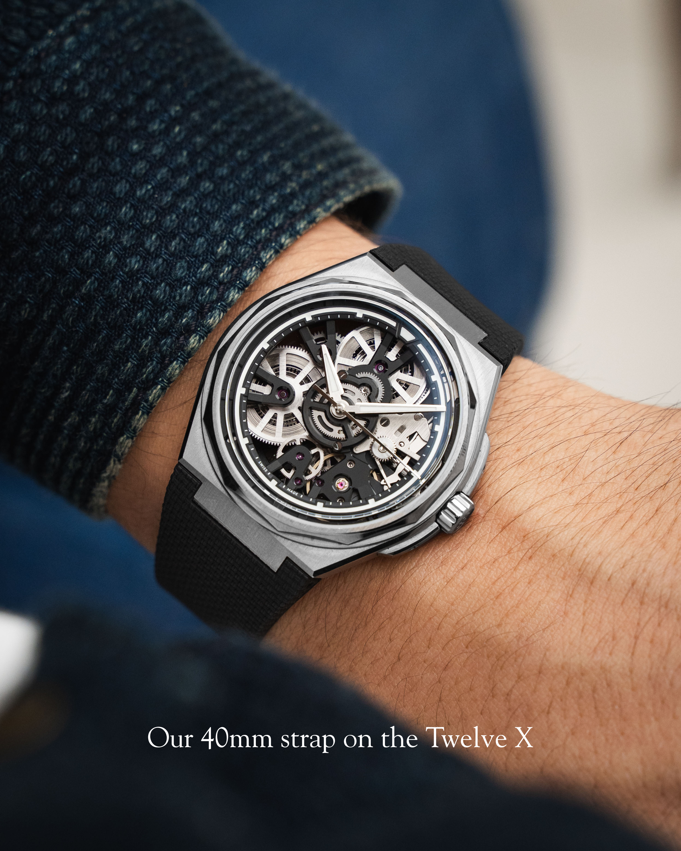 The sailcloth pattern complements The Twelve’s dial pattern perfectly, while the FKM rubber construction ensures durability, comfort, and resistance to dust, aging, and weather — staying fresh wear after wear.