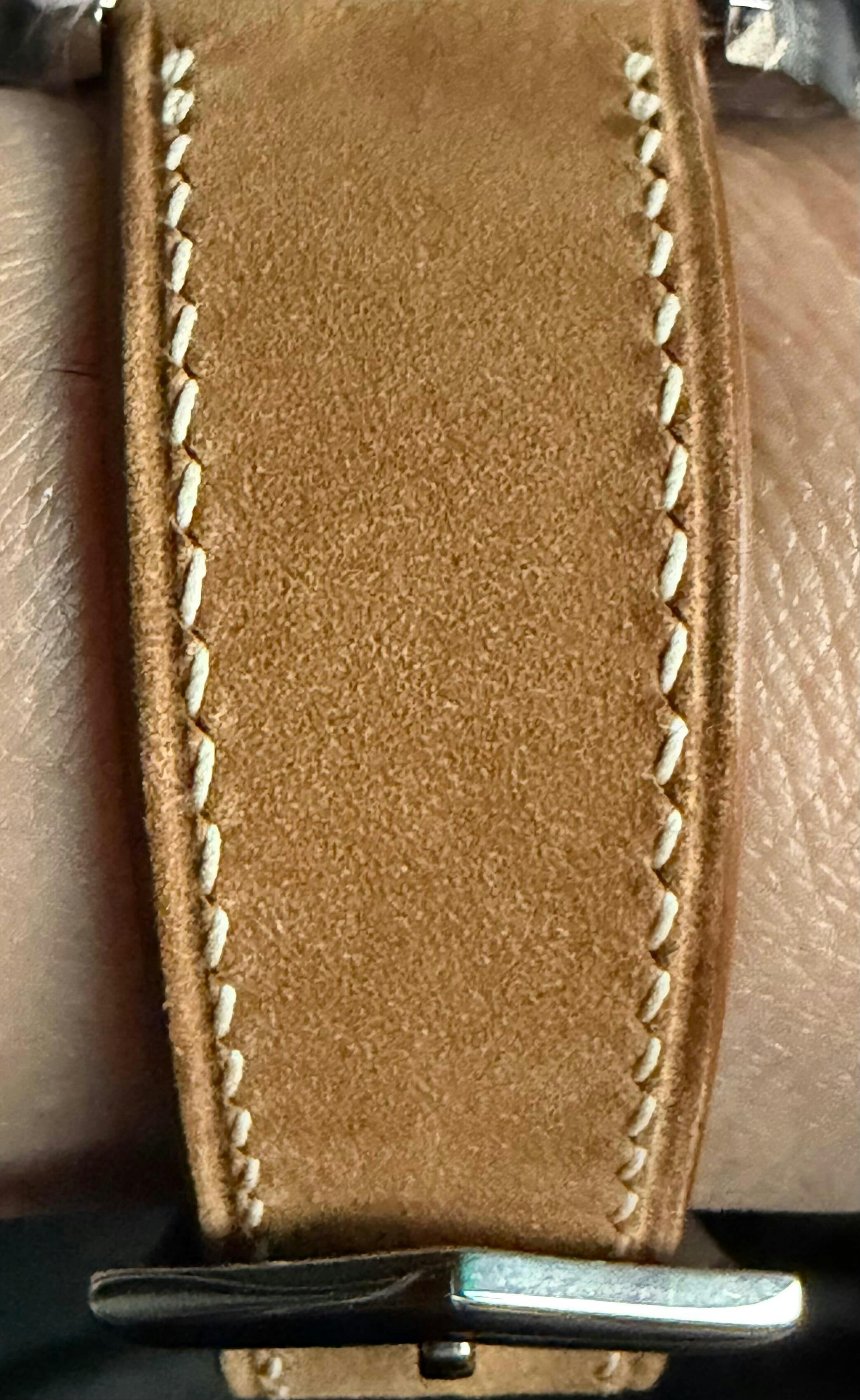 Nubuck has a soft touch with a short and even nap. It is supple and flexible from the start, but yet has just the right amount of structure. This strap is great if you are looking for something that's casual enough for all your daily activities, soft and comfortable to the touch, and an alternative to regular leather texture.