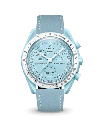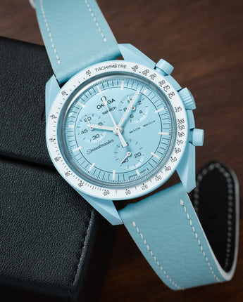 We've developed a total of 11 designs, curated to compliment each of the first 11 MoonSwatches, allowing the pairing to be seamless. These straps use the same leather and style from straps you love from Delugs, but with characteristics of two-tone accents in the stitching, edge paint and keepers.