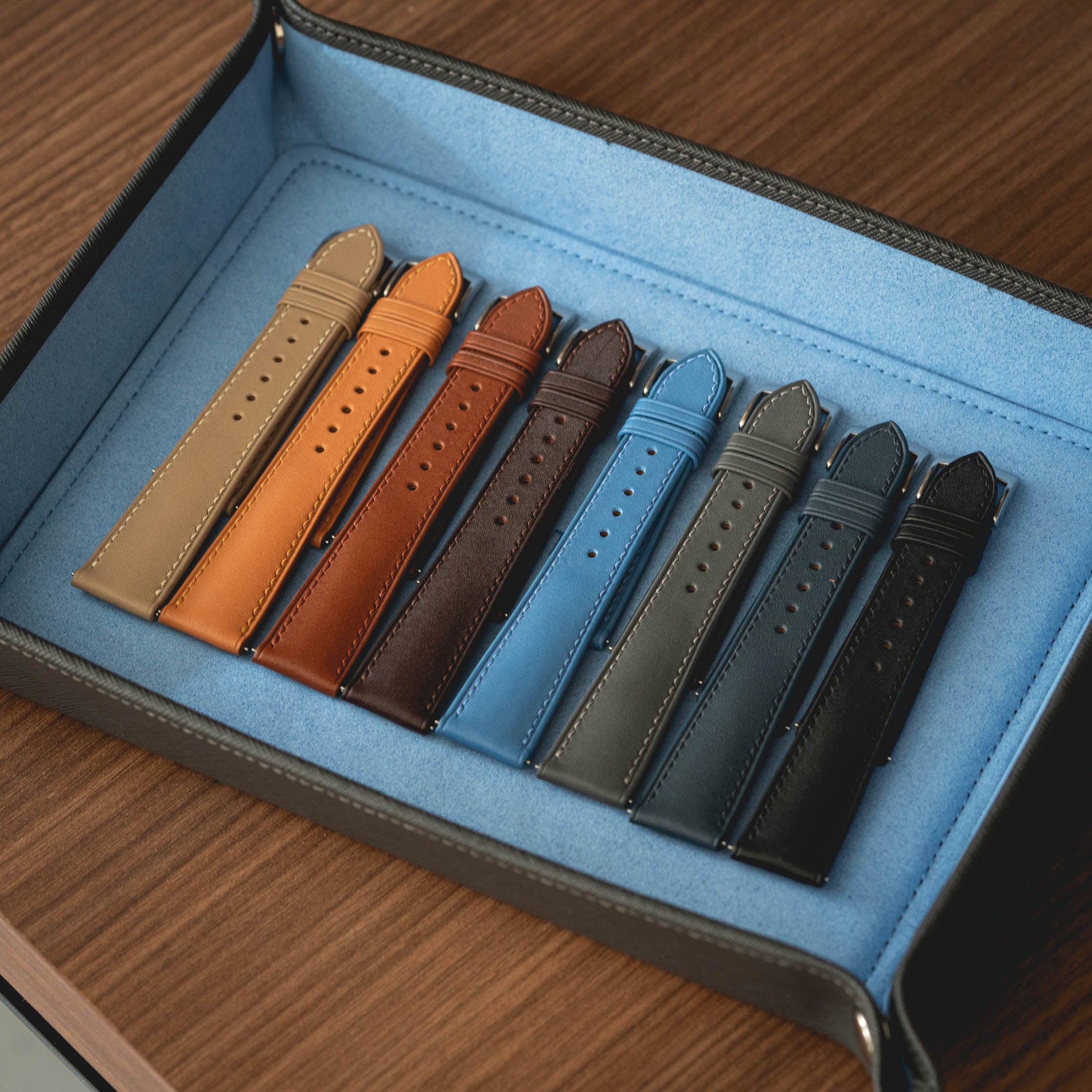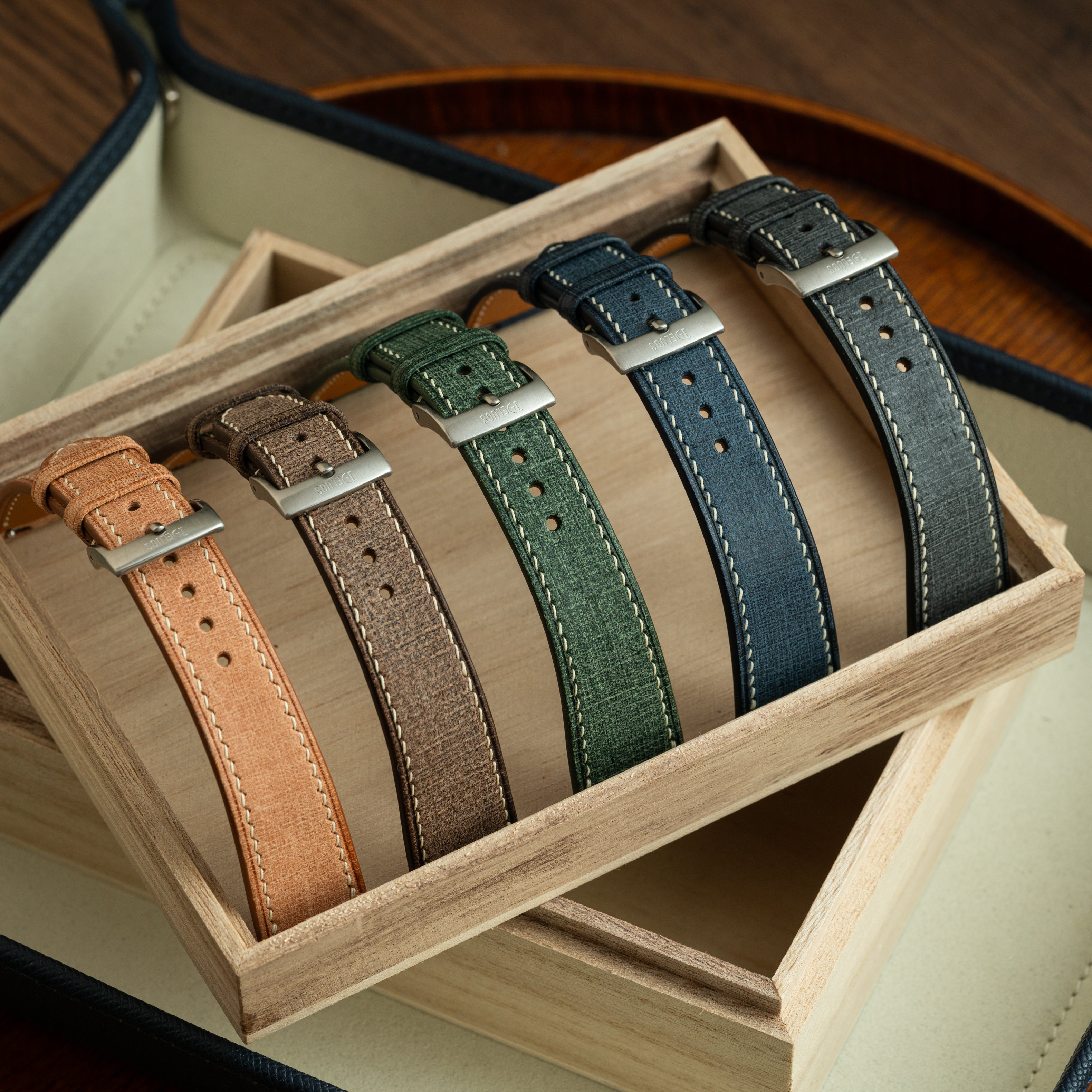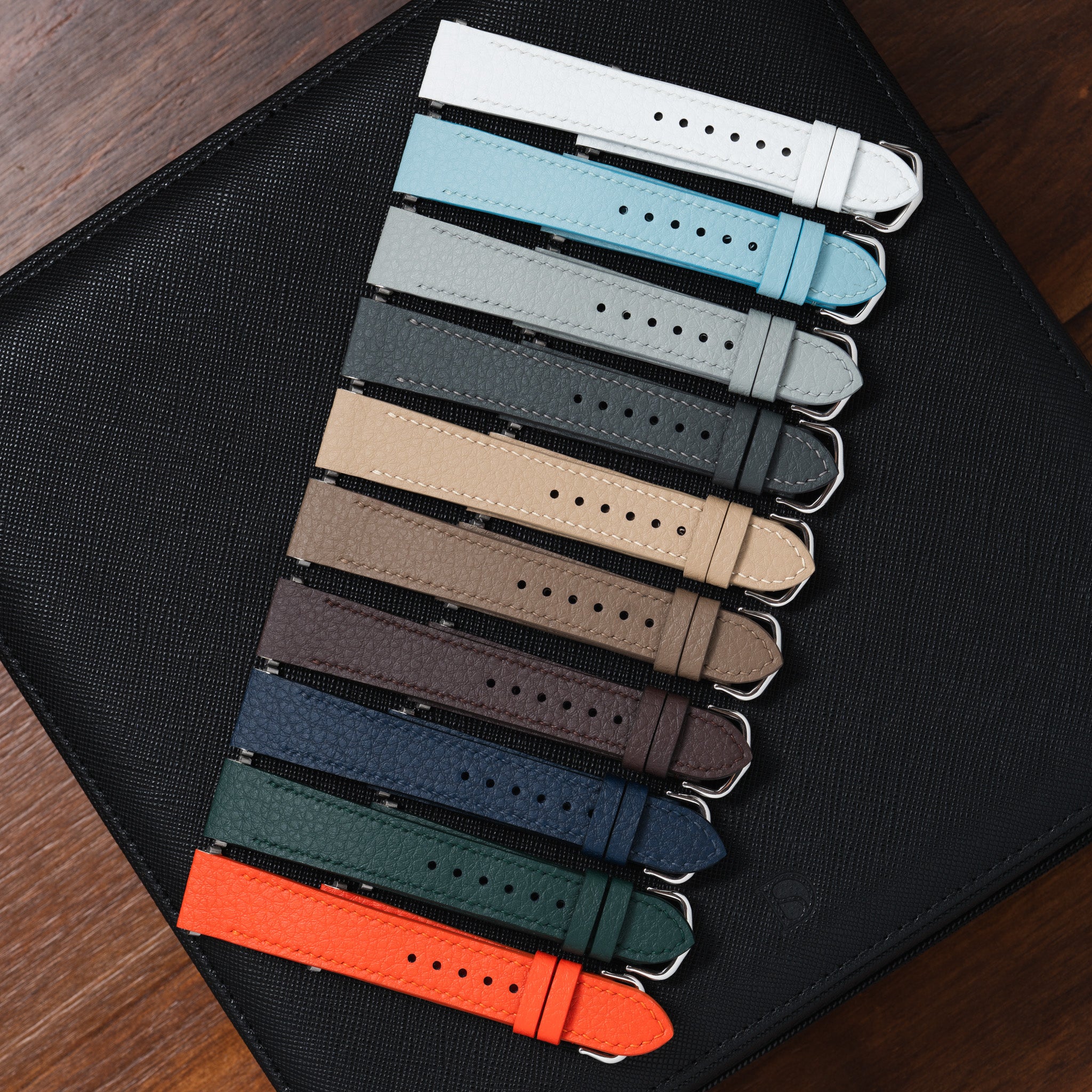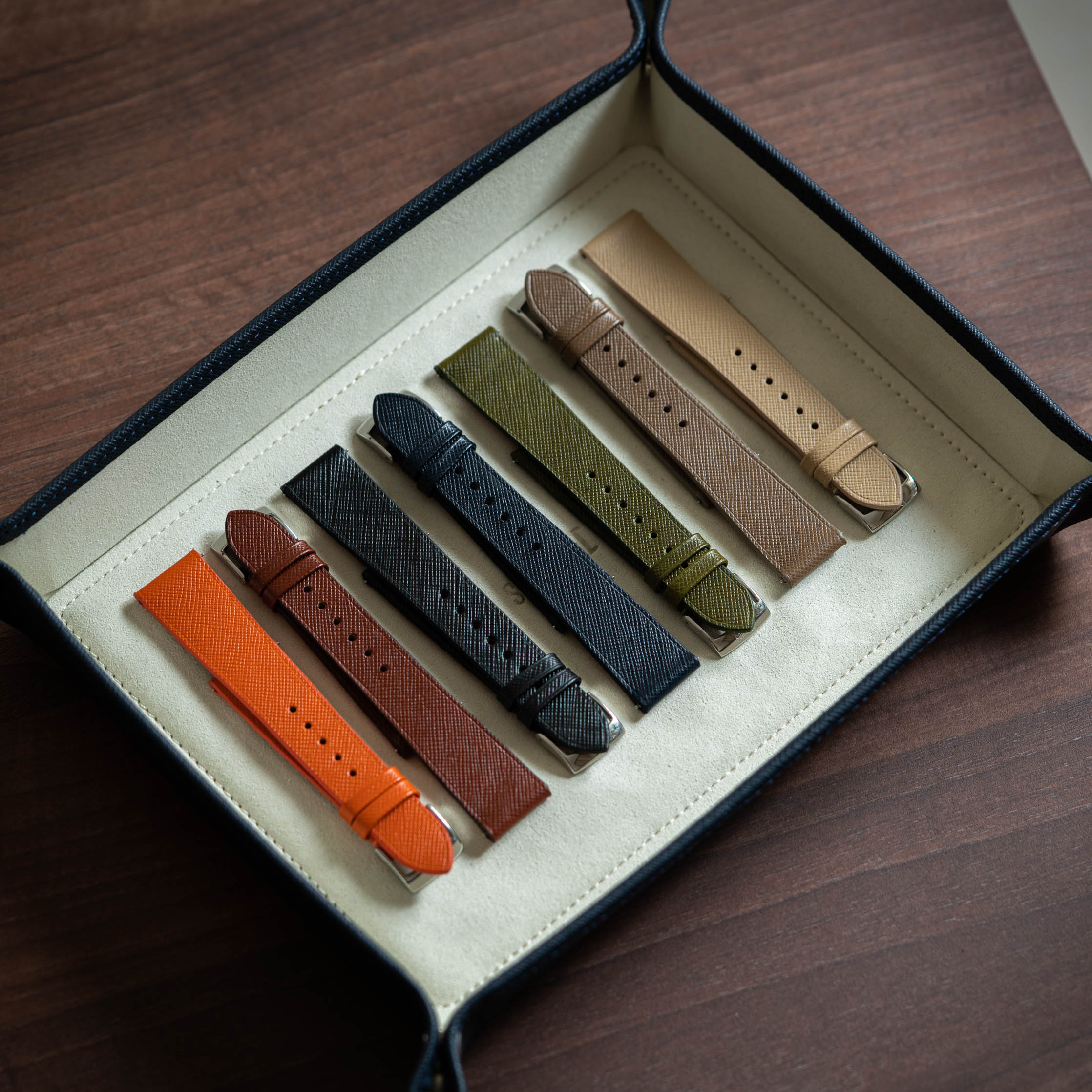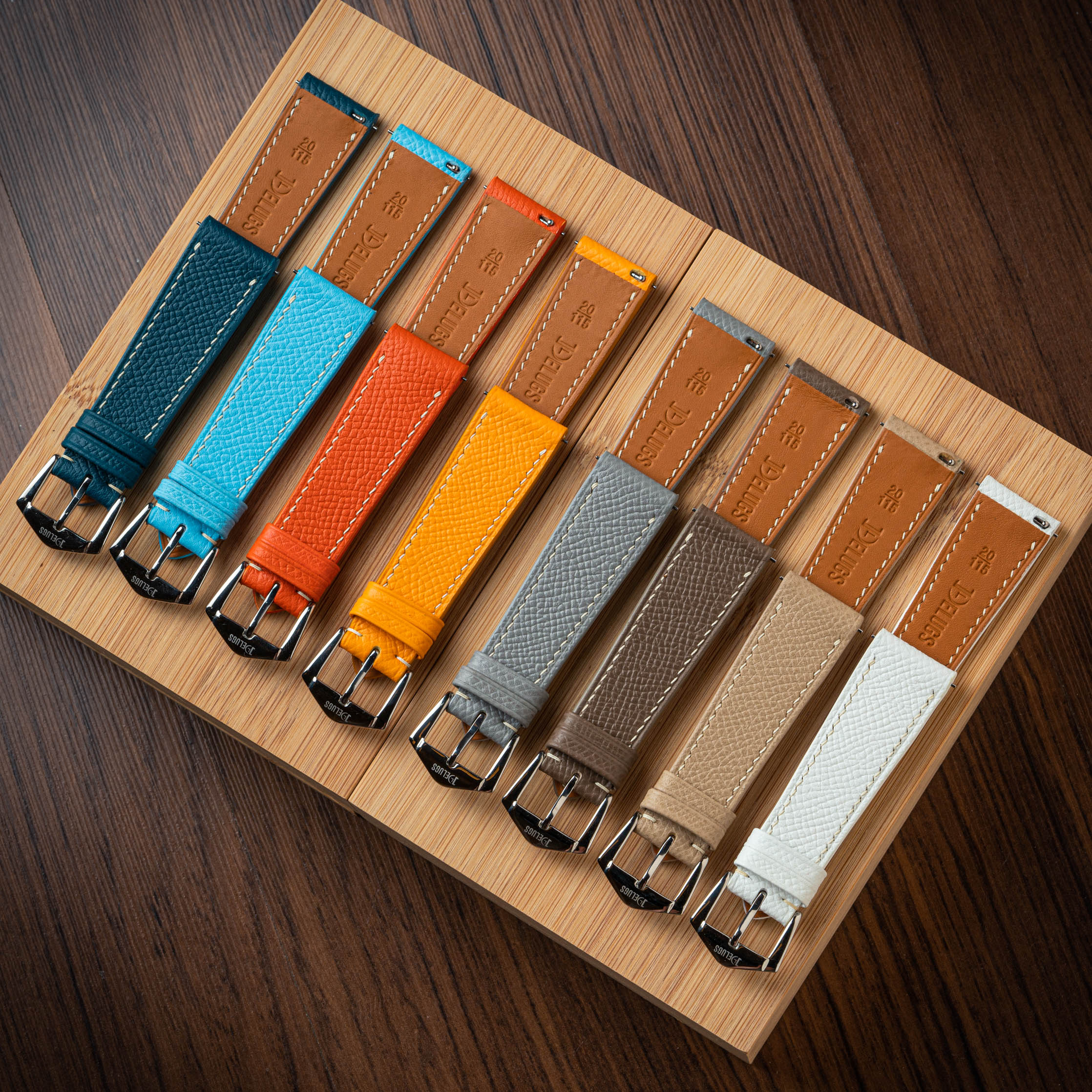A firm leather with a hatch grain embossed pattern, Epsom is well-known for its quality, durability, and wide range of colours. Owing to the embossing process, Epsom has a certain level of rigidity and will sit sturdy and secure on your wrist. This leather is easy to clean and is highly resistant against scratch and wear, and will maintain its rich colour without forming a patina.