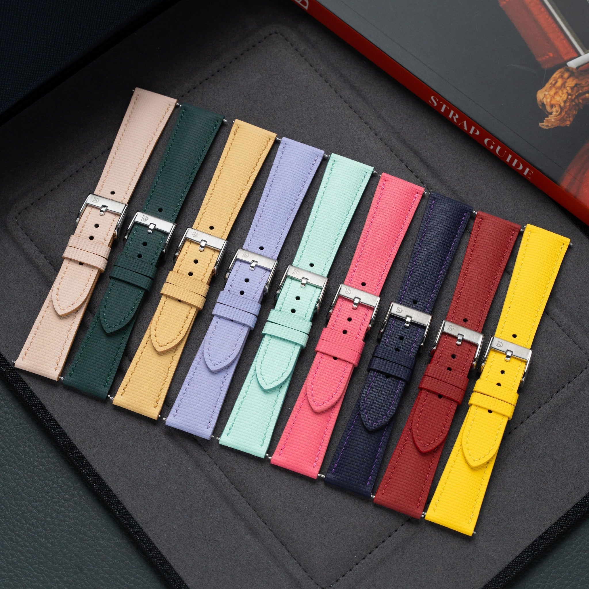 Alcantara is a cutting-edge material that offers unparalleled aesthetic and sensory qualities. While it is most similar to suede and microfibre, it would be inaccurate to categorise Alcantara as any of those materials. It is most commonly used in the interior of luxury cars, but its use has since expanded to everyday goods like wallets, card holders, phone covers, bags, etc. It is extremely soft to the touch, and provides a very luxurious feel when made into a strap.