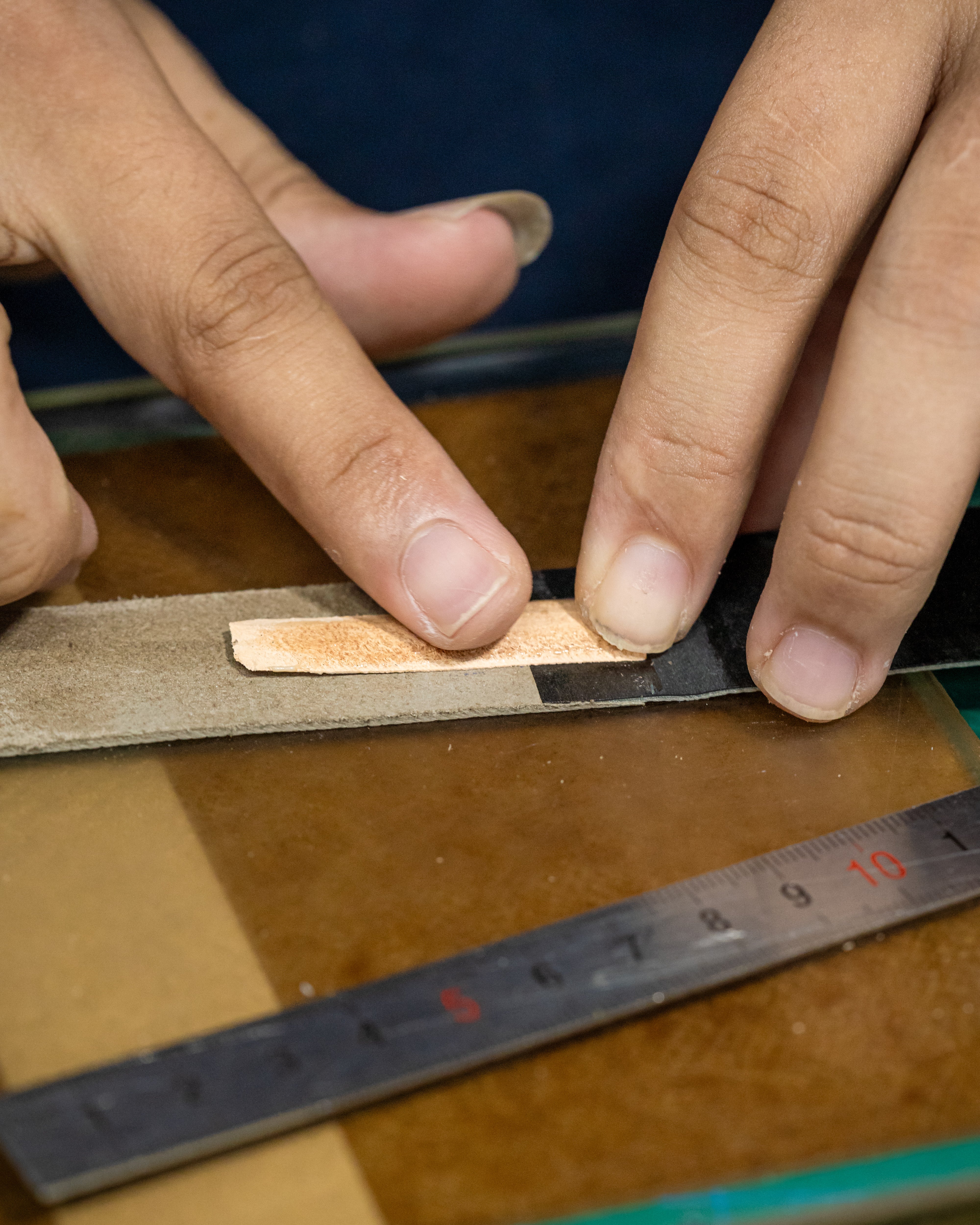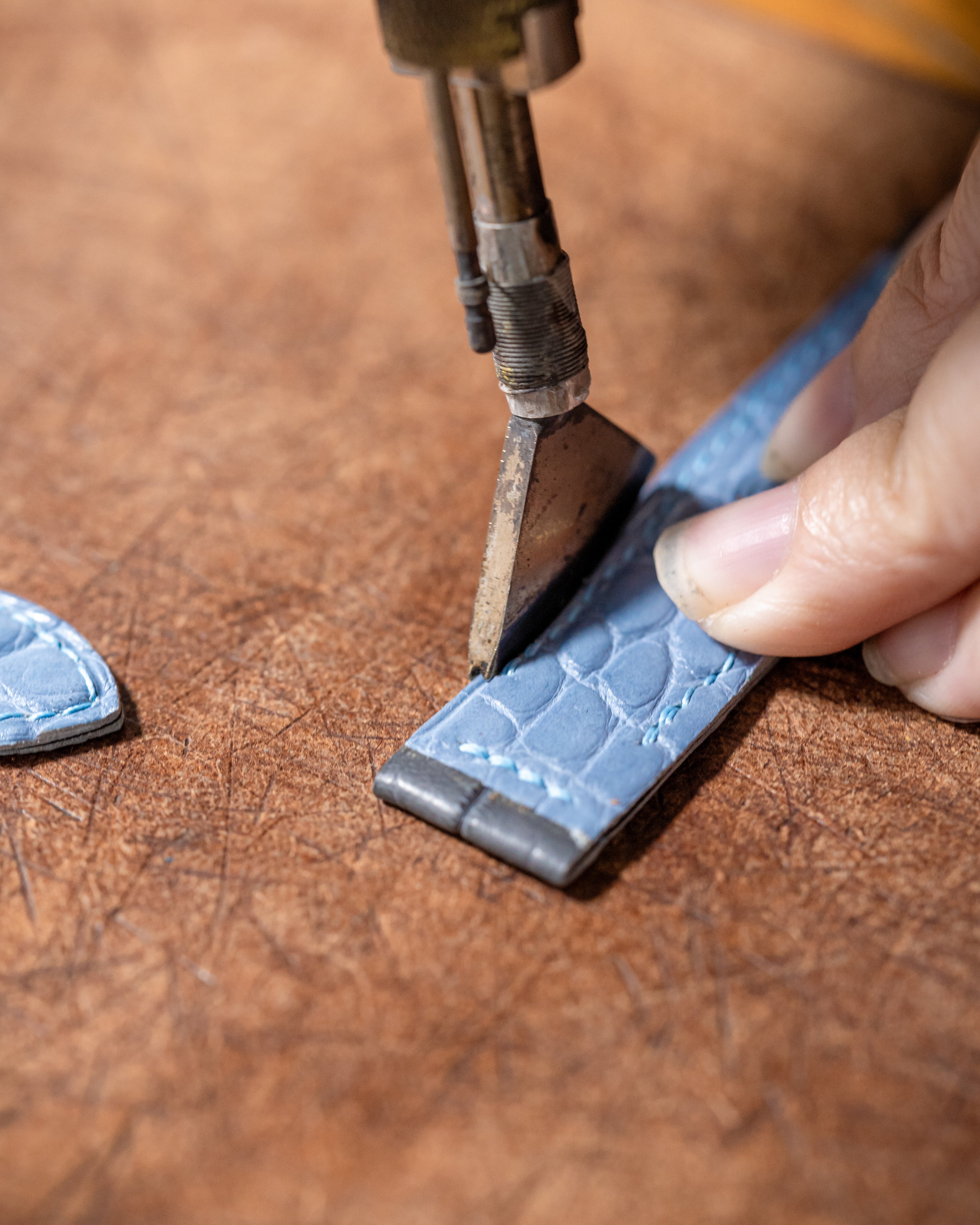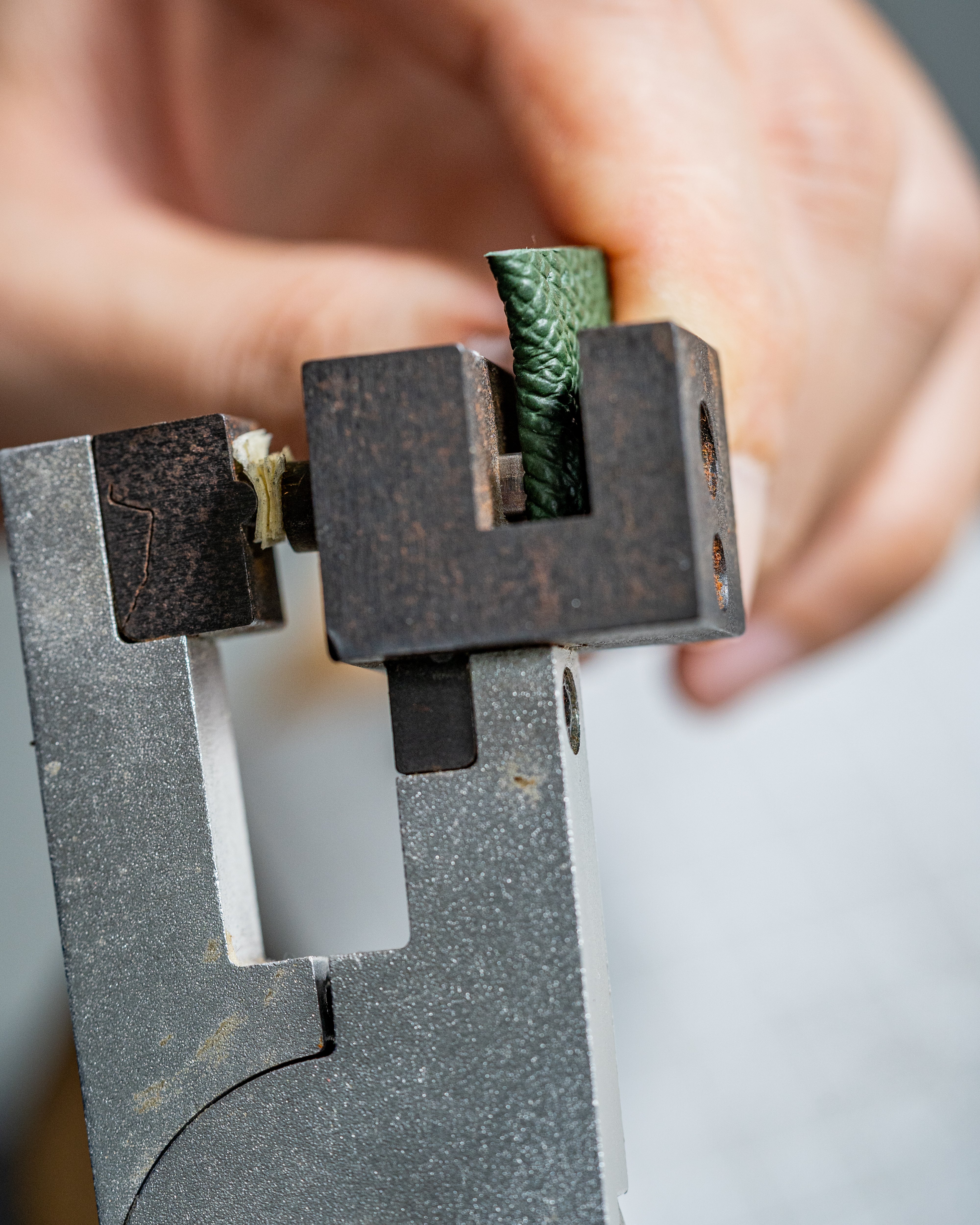 The strap is cut into its precise shape with the help of a die press for standard sizes, or hand-cut for custom shapes and sizes.
