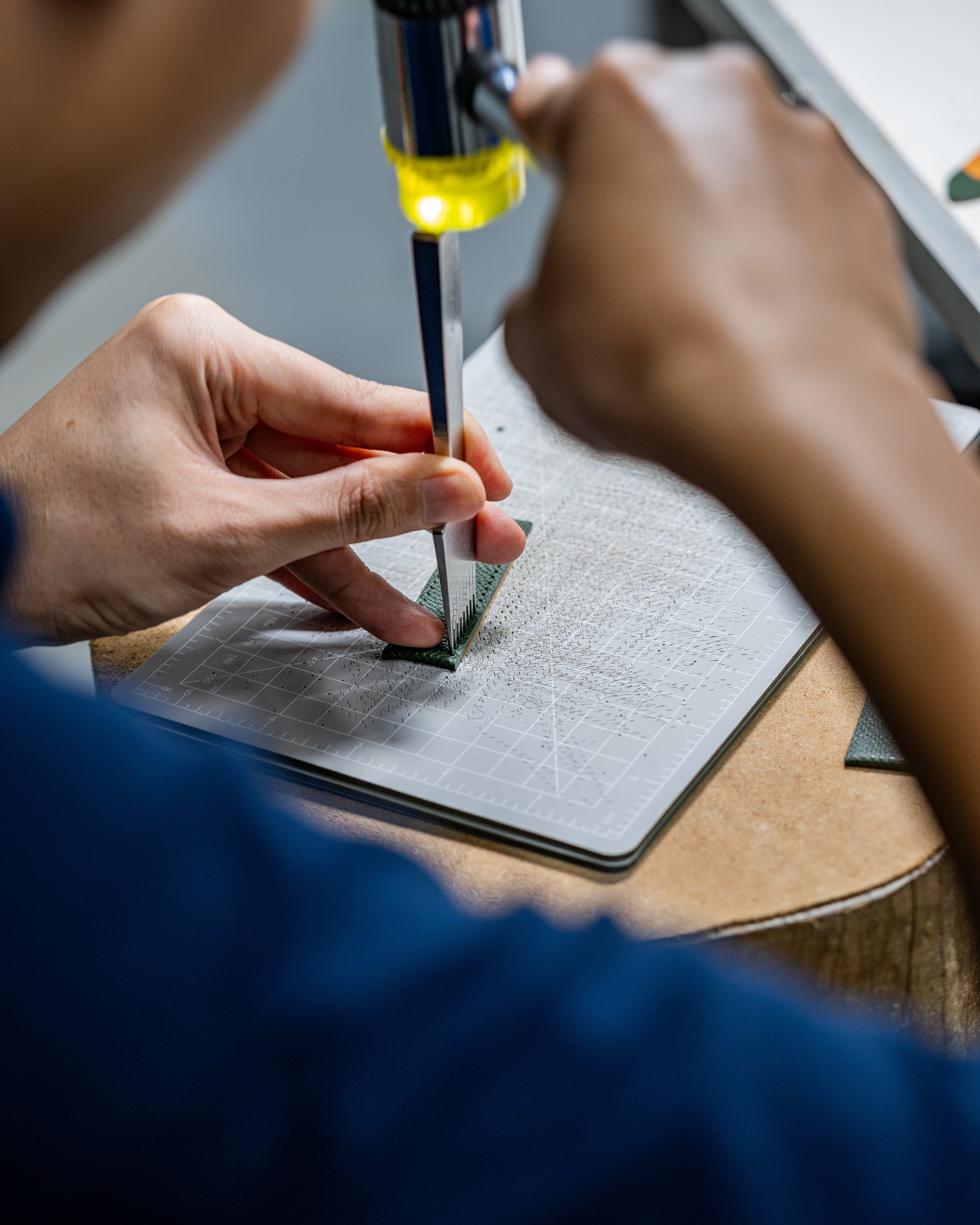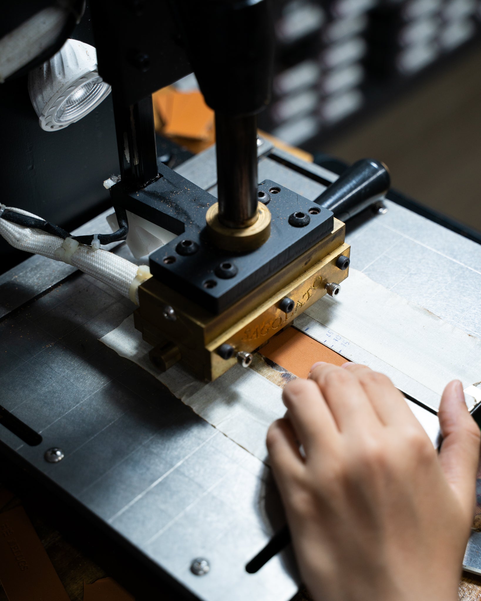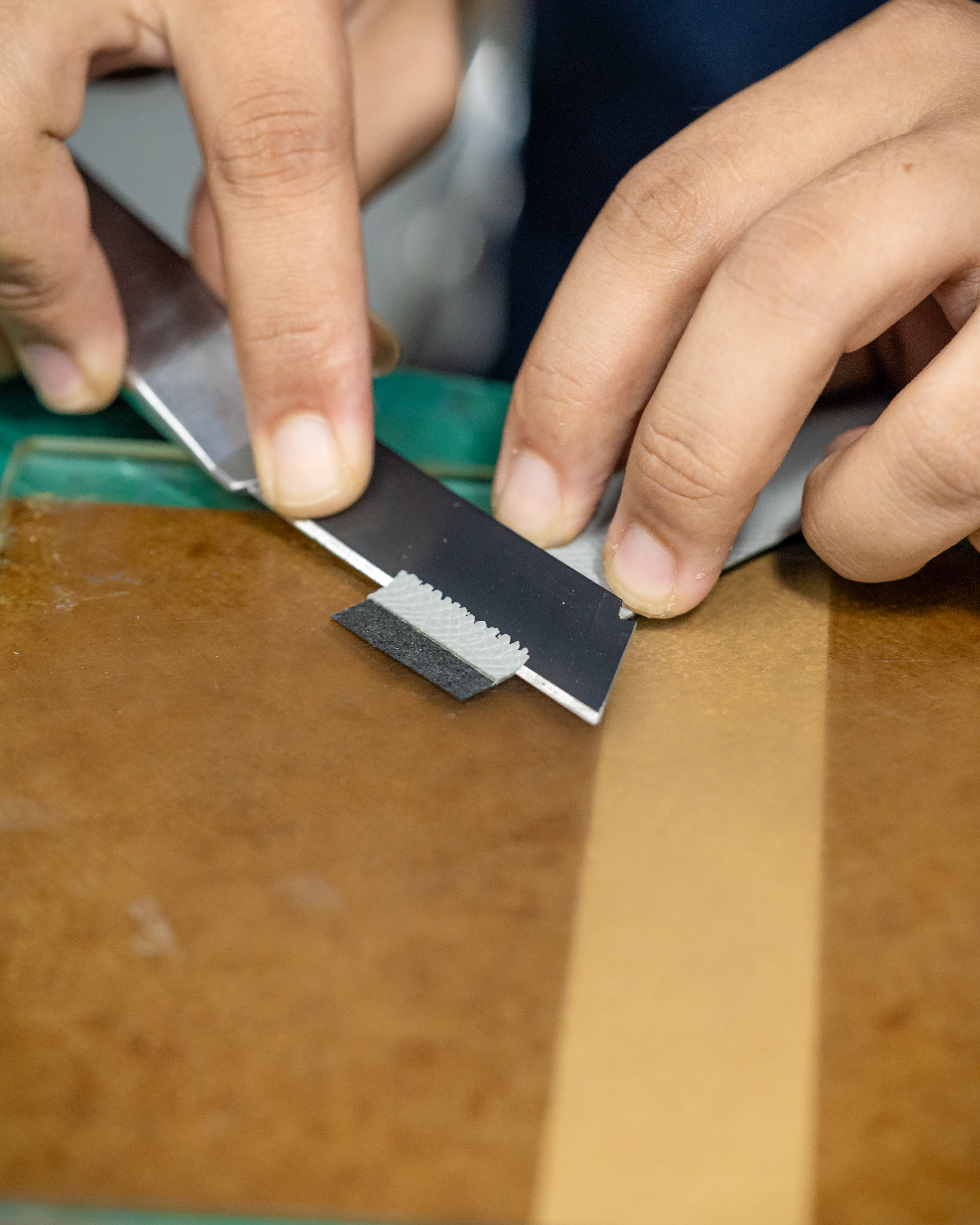 The strap is cut into its precise shape with the help of a die press for standard sizes, or hand-cut for custom shapes and sizes.