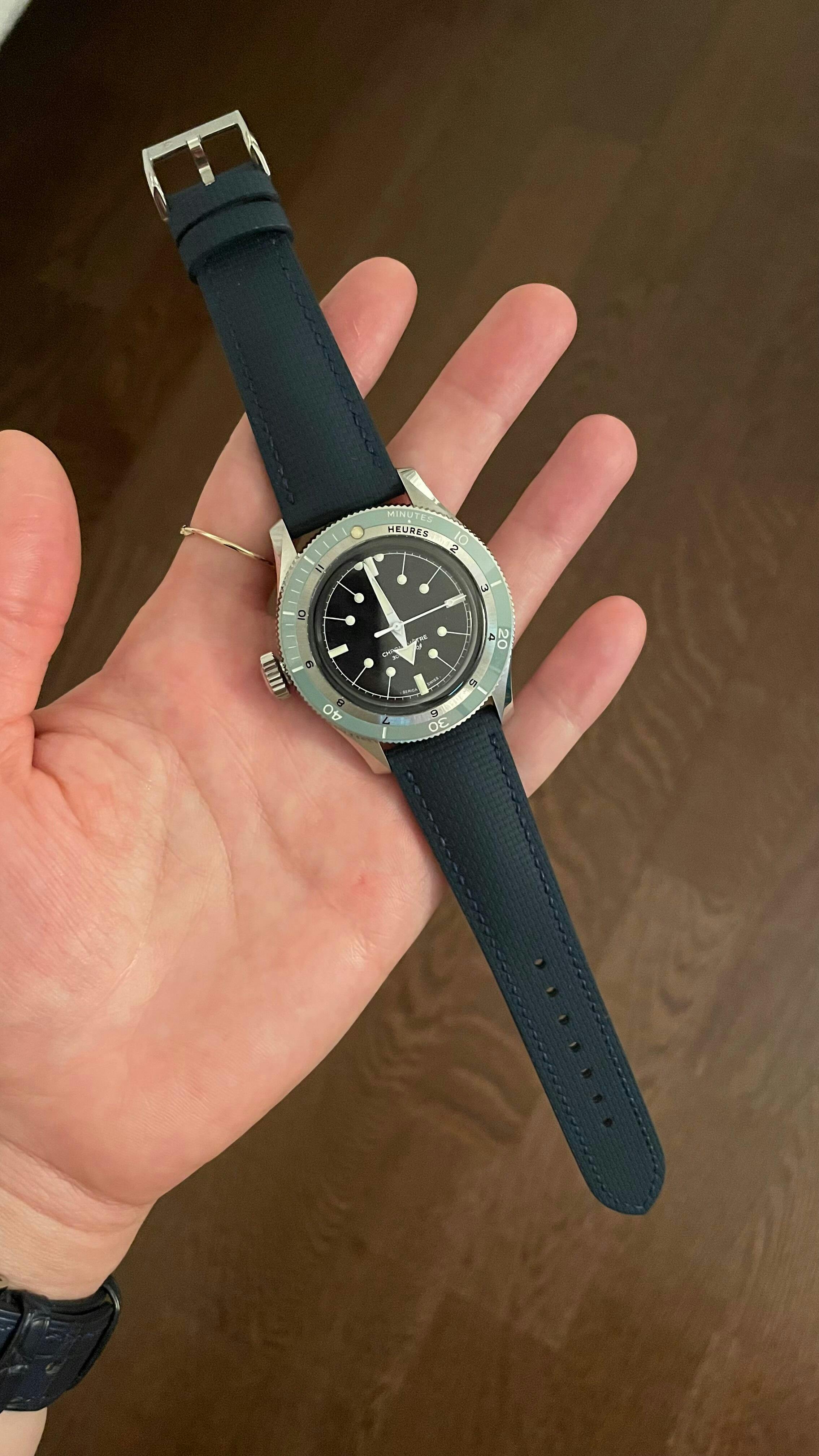 Very solid strap option for the Santos, blows my mind that Cartier makes this awesome strap change system for their best sports watch and then misses the chance to offer a range of straps. Guess that's what Delugs is for. Comfortable, easy to size, good for days when I want to dress the watch down a bit. Release systems is different from the OEM bracelet, but you get used to it.