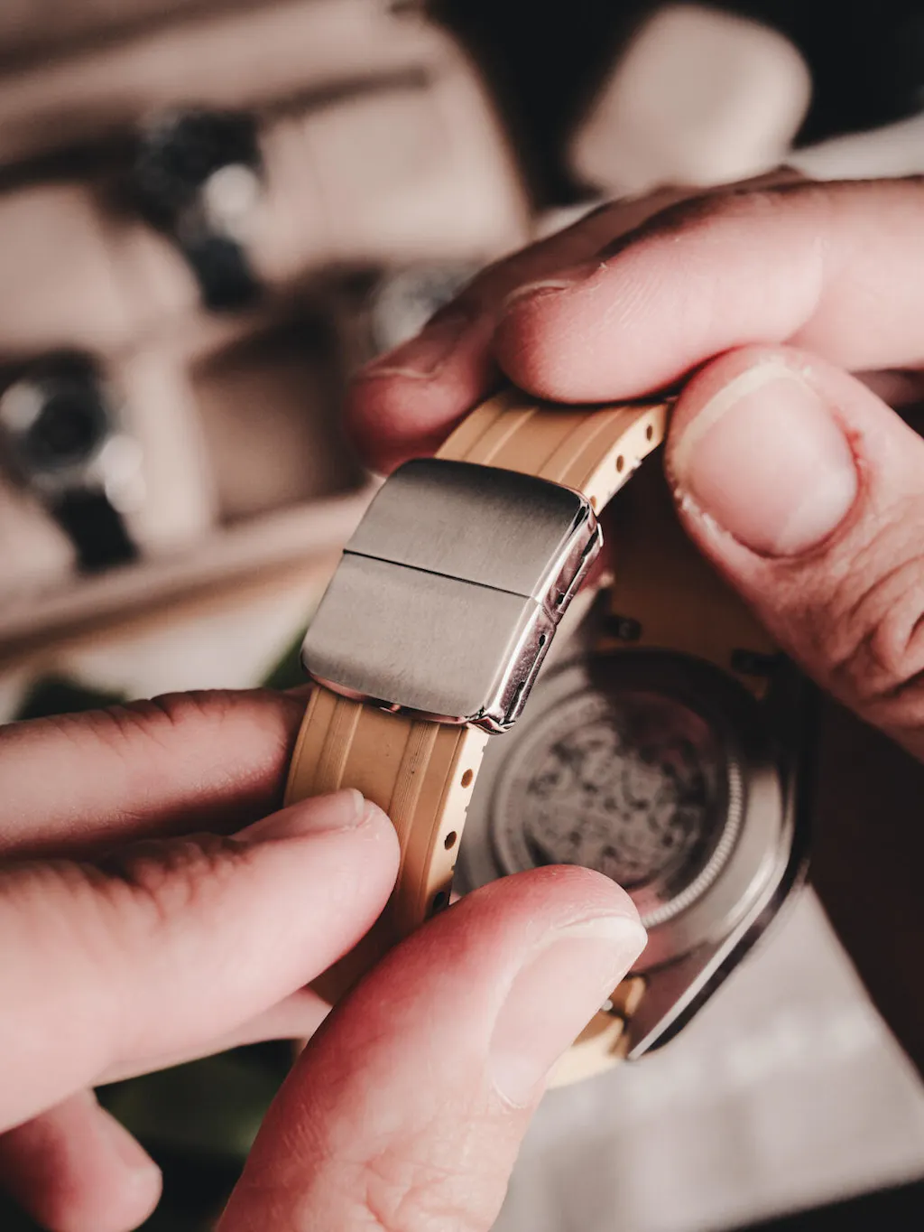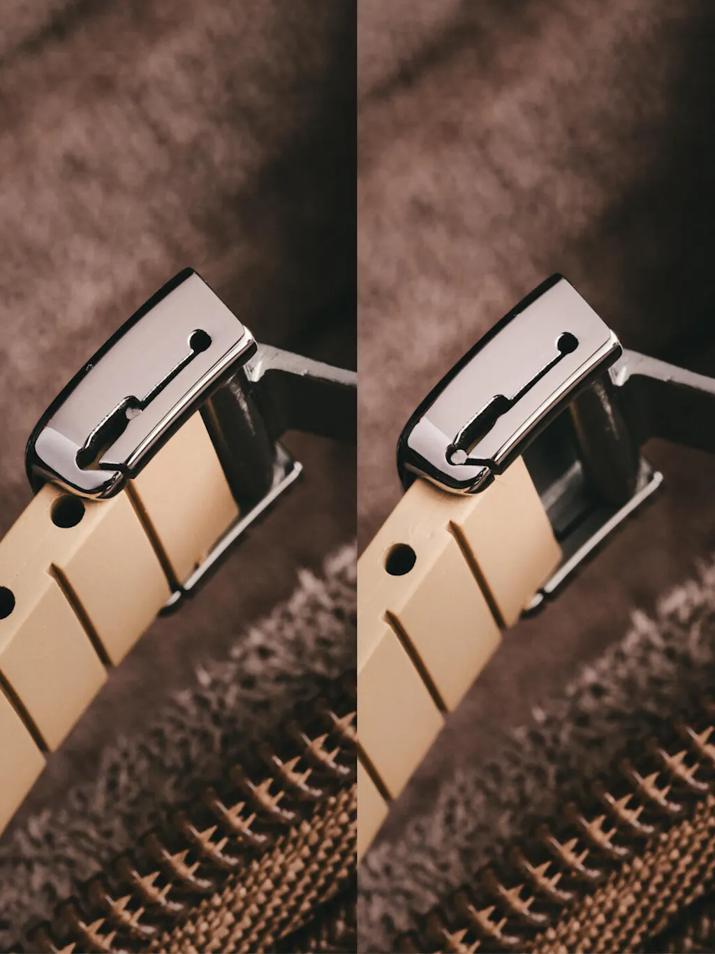 The concept is simple: on-the-fly micro-adjustment on a rubber strap, no tools needed. You just push or pull tthe strap through the clasp to fine-tune the fit. In daily use, that’s more than enough to get things exactly where you want them.