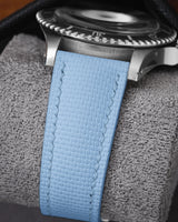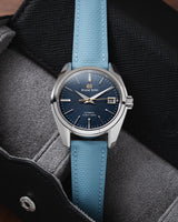 Swapping the bracelet for this Delugs Baby Blue Sailcloth Signature Strap really elevates the look of the Grand Seiko White Birch SLGH005. Handcrafted from durable sailcloth with a baby blue finish, this strap offers both toughness and comfort. Its quick-release spring bars make it easy to swap and perfect for changing up the style without tools. The icy blue tones beautifully complement the textured dial, giving this piece a refined yet modern edge.
