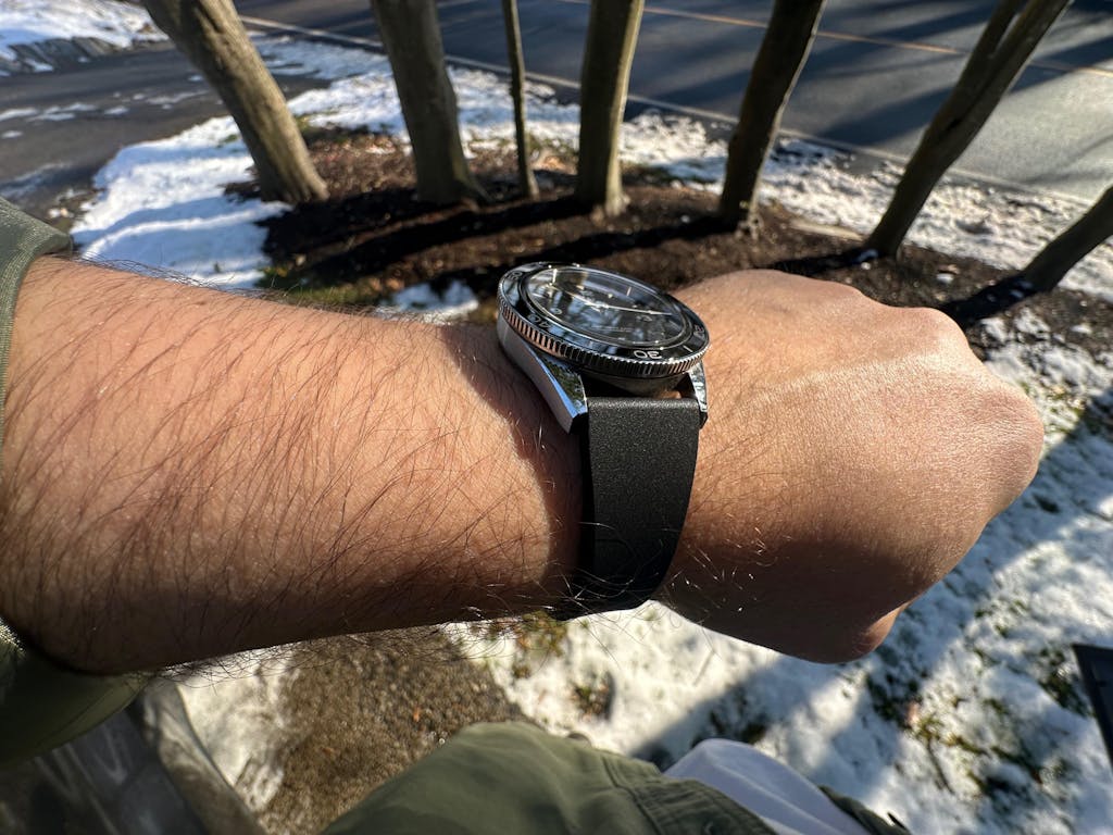 The strap is crafted with a rubber lining, for increased sweat resistance while worn on the wrist.