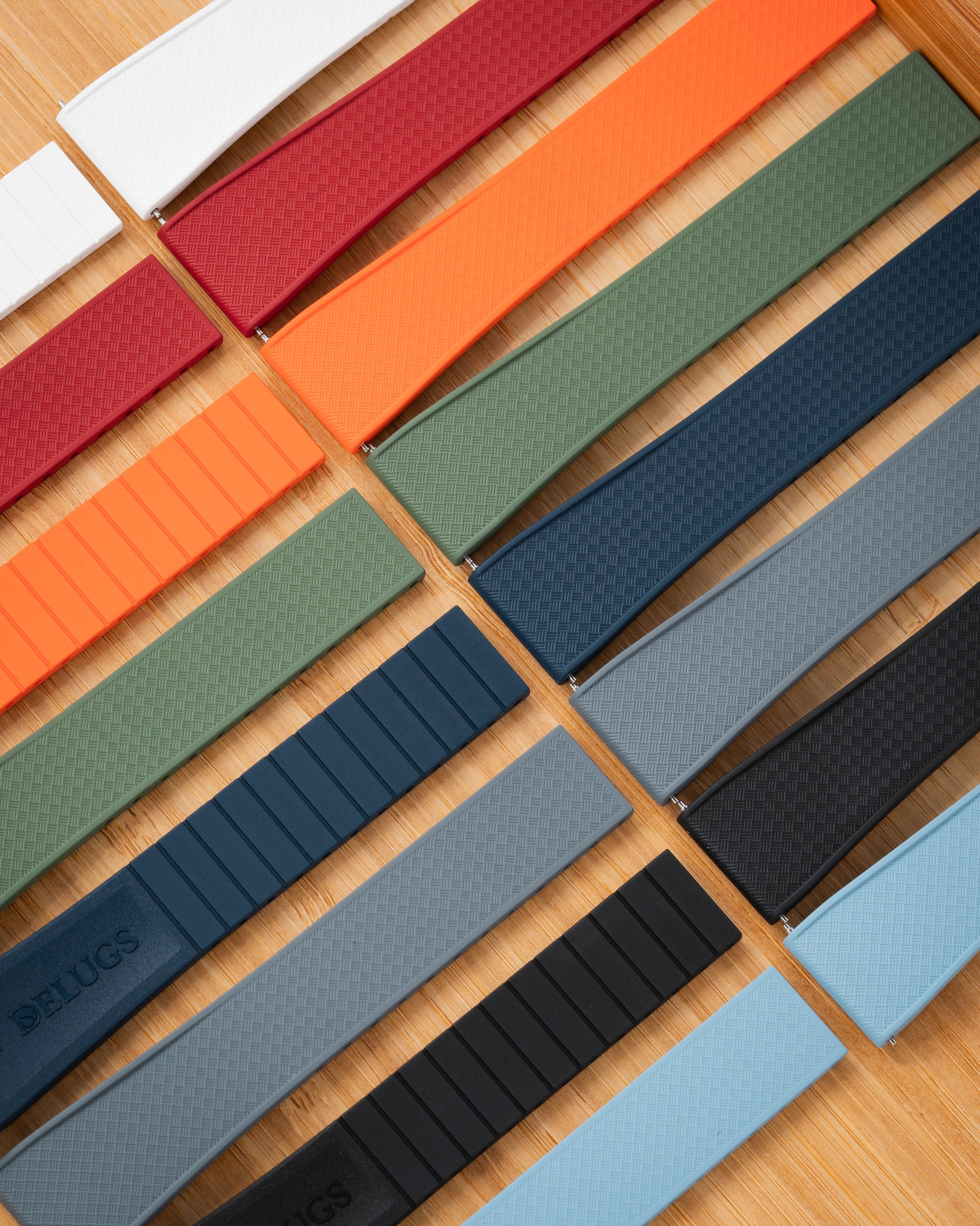 If you're searching for a Delugs strap to use with a vintage watch, be sure to check in with our Customer Service. Vintage watches sometimes use odd widths (17.5mm) or have shallow spring bar plots. This can increase the likelihood of slippage, even with the correct strap installed. Our trained staff will advise on the best course of action for a perfect fit.