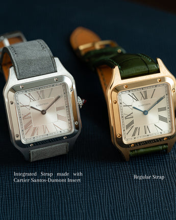 Cartier Santos-Dumont line is extremely well-received and very versatile with leather straps given the dressy nature of the watch. However, there is a lack of 3rd-party strap options as a special insert is needed to ensure that the straps fit flush with the watch. While regular straps could be used, it does not create an integrated fit that flows nicely with the case, which is not ideal. We are now able to craft integrated straps using the same metal adapters, to craft a strap that is a perfect fit for the Cartier Santos-Dumont. Read more about this release here.
