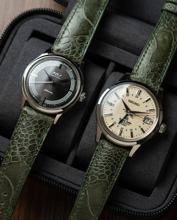 Ostrich Leg leather has beautiful texture, soft and supple, with little to no break-in time needed, and has a ton of colours available. It's the perfect alternative to Alligator if you're looking for another exotic strap.