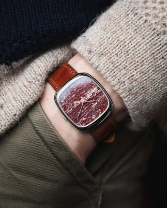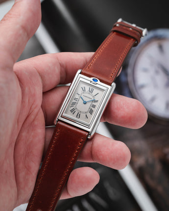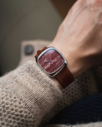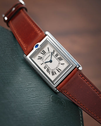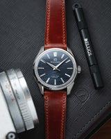 The Shell Cordovan we use is sourced from Shinki Hikaku tannery in Japan. Typical of most Shell Cordovan, it has a high gloss finish. Unique to Shinki's Shell Cordovan, the surface is extremely uniform and clean, with a beautiful depth of colour. This leather is so durable that it’s likely to last as long as your timepiece!