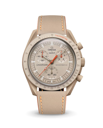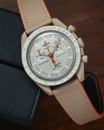 We've developed a total of 11 designs, curated to compliment each of the first 11 MoonSwatches, allowing the pairing to be seamless. These straps use the same leather and style from straps you love from Delugs, but with characteristics of two-tone accents in the stitching, edge paint and keepers.