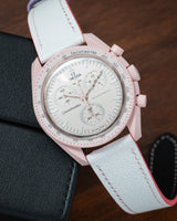 We've developed a total of 11 designs, curated to compliment each of the first 11 MoonSwatches, allowing the pairing to be seamless. These straps use the same leather and style from straps you love from Delugs, but with characteristics of two-tone accents in the stitching, edge paint and keepers.