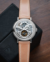 The Shell Cordovan we use comes from Shinki Hikaku tannery in Japan. Typical of most shell cordovan, it has a high gloss finish. Unique to Shinki Shell, the surface is extremely uniform and clean, with a beautiful depth of colour. This leather is so durable that it is likely to last as long as your mechanical timepiece!