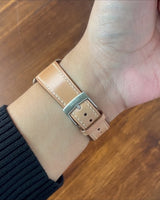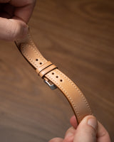 This strap will patina over time, and hence the surface texture and colour of the strap will change with use. Patina is a soft glow on the leather that develops through friction and wear. Patina is often said to enhance a product (it gets better with age) as the leather product develops a character that is an amalgamation of all the conditions that it's exposed to.
