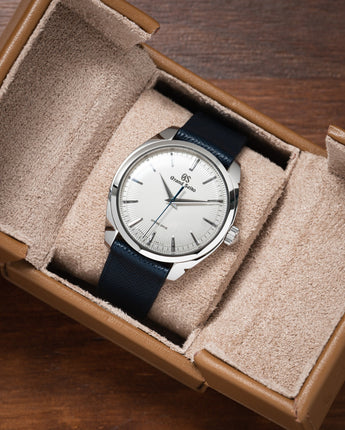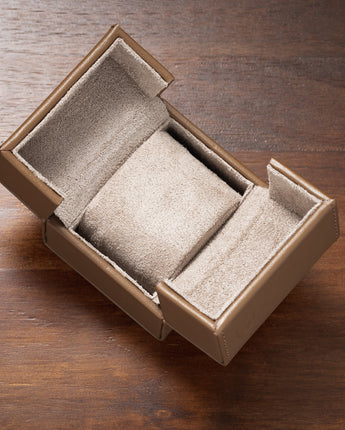 Form and function are both key in our design, which incorporates a satisfying tactile snap mechanism that shuts securely without the use of a magnet or closure strap, ensuring your watch stays safe and protected, but also keeping with a clean exterior aesthetic. It is also paired with a compressible cushion which can be squeezed to accommodate a range of wrist sizes. Surrounding your watch is a soft fabric surface to protect your watch and clasp from scratches.