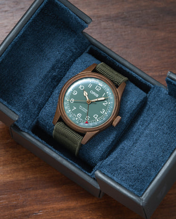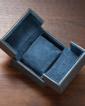 Form and function are both key in our design, which incorporates a satisfying tactile snap mechanism that shuts securely without the use of a magnet or closure strap, ensuring your watch stays safe and protected, but also keeping with a clean exterior aesthetic. It is also paired with a compressible cushion which can be squeezed to accommodate a range of wrist sizes. Surrounding your watch is a soft fabric surface to protect your watch and clasp from scratches.